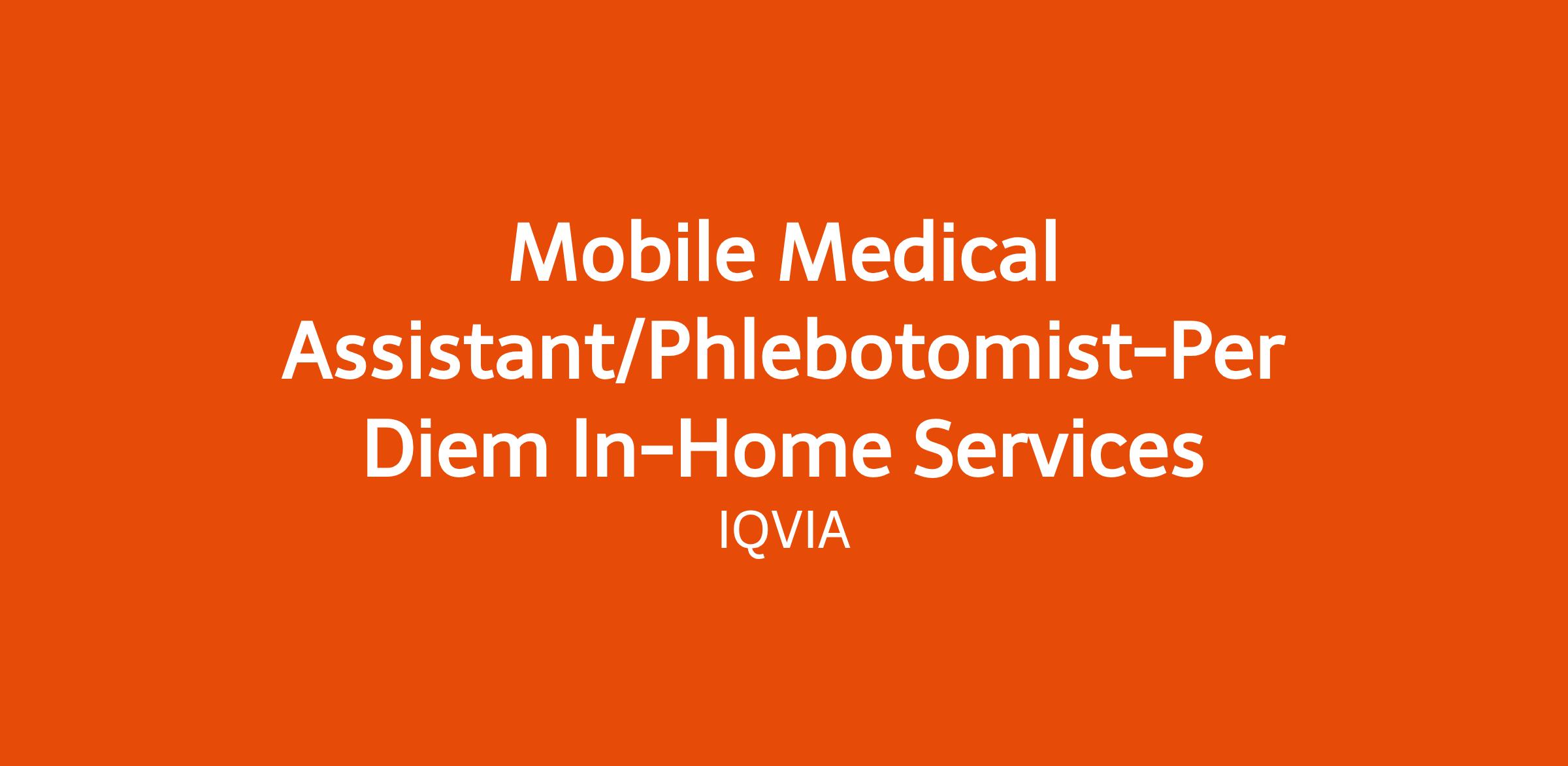 IQVIA’s In-Home Clinical Solutions team seeks a qualified and dedicated Mobile Medical Assistant / Phlebotomist to support patient care by delivering in-home diagnostic services. This per diem role involves traveling to patient residences to perform clinical services such as, but not limited to, phlebotomy, electrocardiograms (EKGs), and macular edema screenings in support of treatment initiation and adherence strategies.