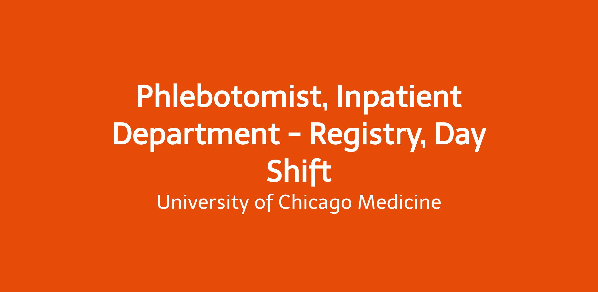 Be a part of a world-class academic healthcare system, University of Chicago Medicine, as a Inpatient Phlebotomist in the Nursing Inpatient Phlebotomy department. Phlebotomists draw blood under minimal supervision. Inpatient Phlebotomists perform blood collections in the adult, non-critical care units of Mitchell and CCD using Epic Beaker Rover. Phlebotomists may be asked to assist in other areas of UChicago Medicine- Hyde Park as needed.