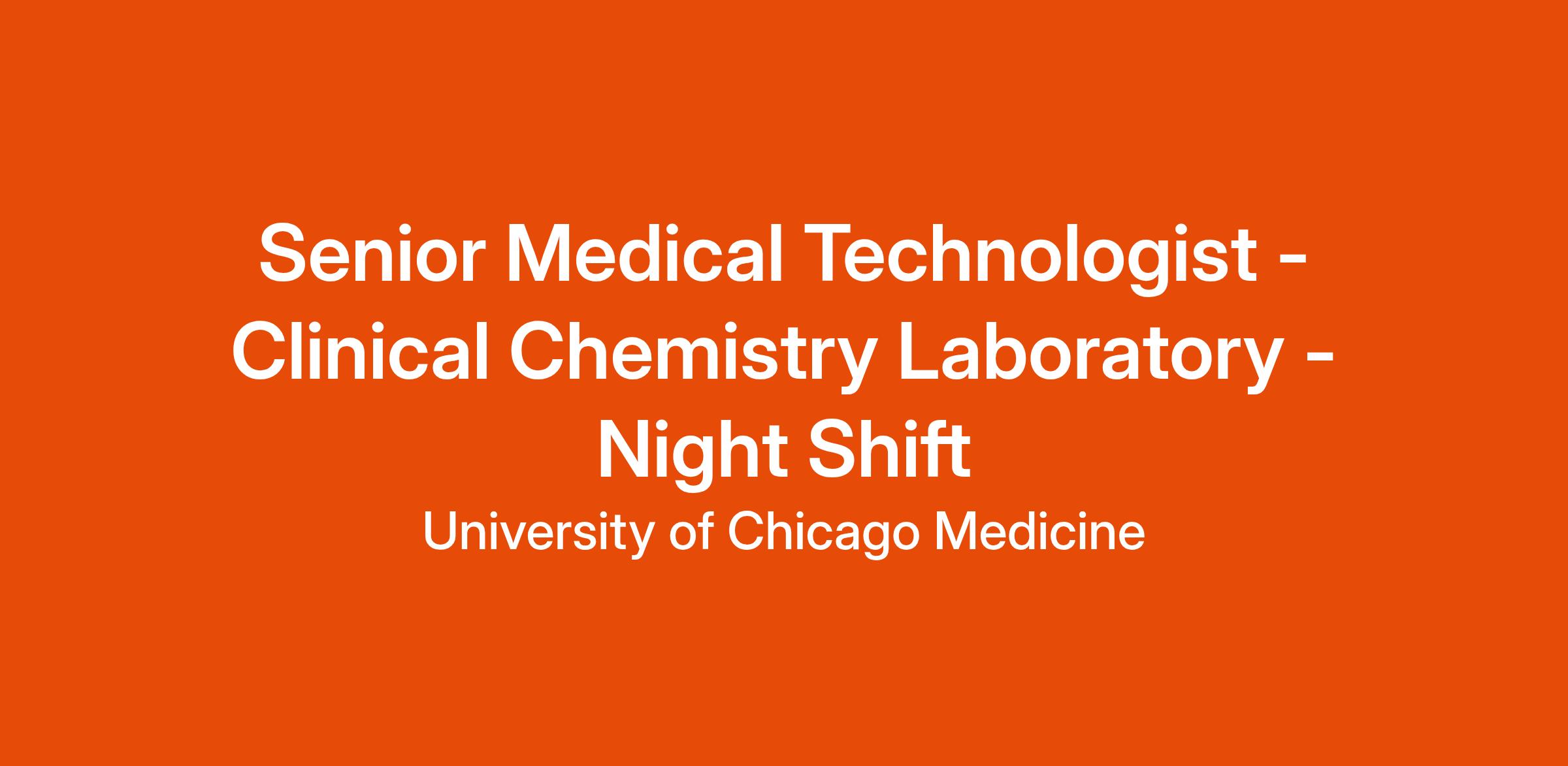 Be a part of a world-class academic healthcare system, UChicago Medicine, as a Senior Medical Technologist in the Clinical Chemistry Lab. In this role as a Senior Medical Technologist you will perform Chemistry lab tests, operate state-of-the-art instruments, and conduct esoteric tests with current technology. Responsible for quality control, instrument maintenance, and method development to support a broad menu of routine and esoteric tests, including diagnostic tests for infectious diseases and allergy identification. Operating within UChicago Medicine's Department of Pathology, we provide reference laboratory testing to various related and unrelated health care entities, managed care organizations and non-affiliated hospitals, outpatient clinics and private physicians' offices. We offer a full range of diagnostic services. Operating within UChicago Medicine's Department of Pathology, we provide reference laboratory testing to various related and unrelated health care entities, managed care organizations and non-affiliated hospitals, outpatient clinics and private physicians' offices. We offer a full range of diagnostic services. This department is Clinical Chemistry Department. This position is a 100% onsite opportunity. You will need to be based in the greater Chicagoland area.